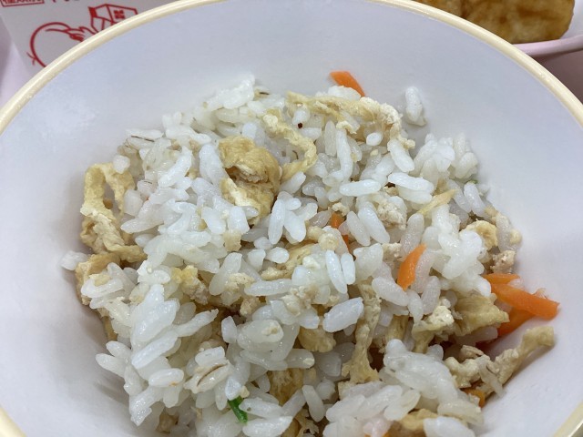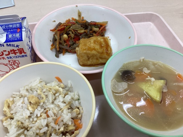 今日のメニューは、「揚げ出し豆腐」に「いろどりきんぴら」、「こぎつねごはん」「さつまいもの味噌汁」と「牛乳」です。さて、お豆腐はそのままでも食すことができますが、煮たり焼いたり、油で揚げたりと、さまざまな調理法を使って美味しくいただけます。江戸時代に書かれた「豆腐百珍」は、今で言うところの豆腐料理のベストセラー本です。お豆腐を美味しく食べるための調理法が書かれています。今日のメニューにある「揚げ出し豆腐」によく煮た料理に、「釈迦豆腐」があります。「豆腐百珍」による、お豆腐を賽の目に切り、それをザルに乗せ、ころころと転がして角を取ります。そして、葛粉をまぶし、ごま油であげれば出来上がります。これを天つゆよりも薄めのだし汁につけて食べる料理です。「釈迦豆腐」の「釈迦」とは、葛粉をまぶして揚げた豆腐が、お釈迦さまの髪の毛である螺髪(らほつ)に似ているから、そのように呼ばれているようです。今日は、これに、さつまいもを入れた味噌汁と組み合わせ、和食の給食として提供しました。