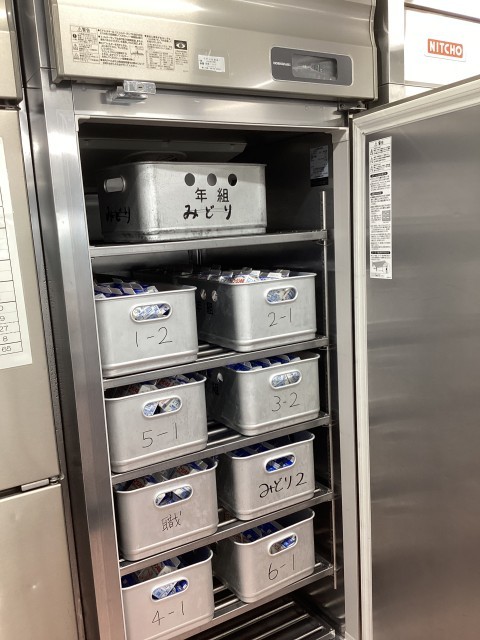 きゅうしょくしつには、ぎゅうにゅうせんようの れいぞうこがあります。