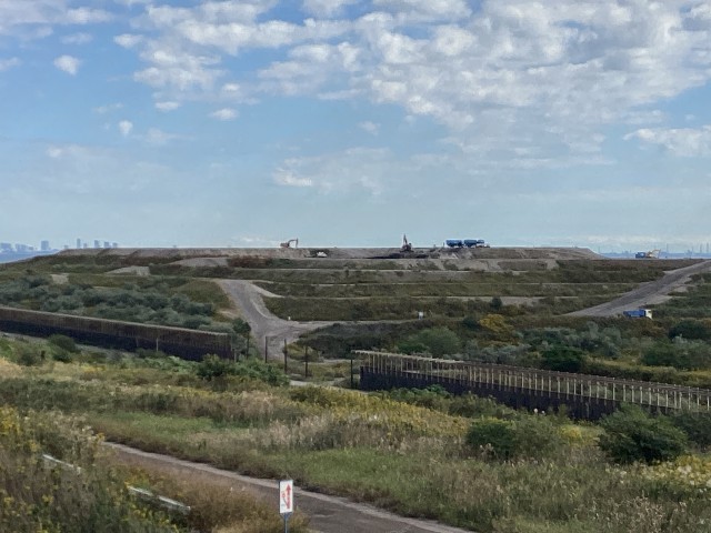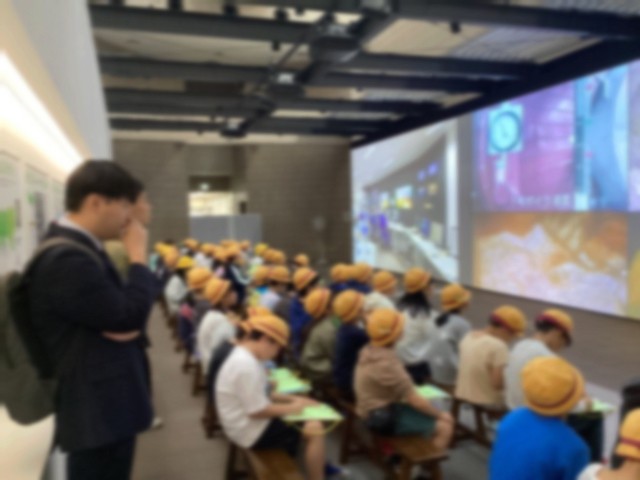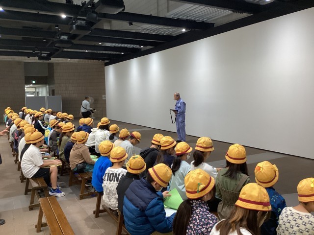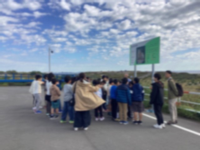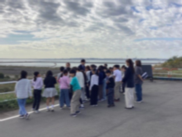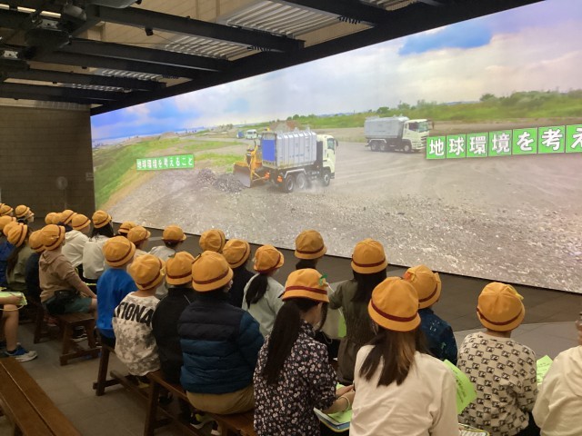 4年生を乗せたバスは、9:10ころに中央防波堤最終処分場近くにある中防堤庁舎内にある環境学習ホールに到着しました。ここで20分ほど映像資料で説明を受けた後、最終処分場をバスに乗って見学しました。