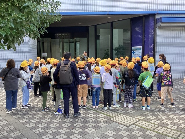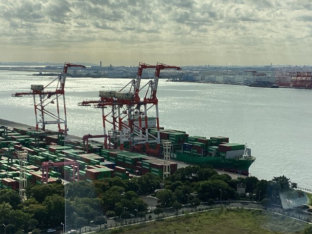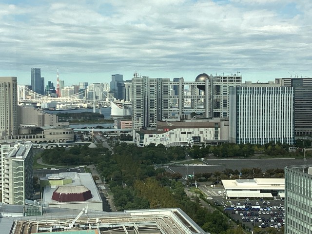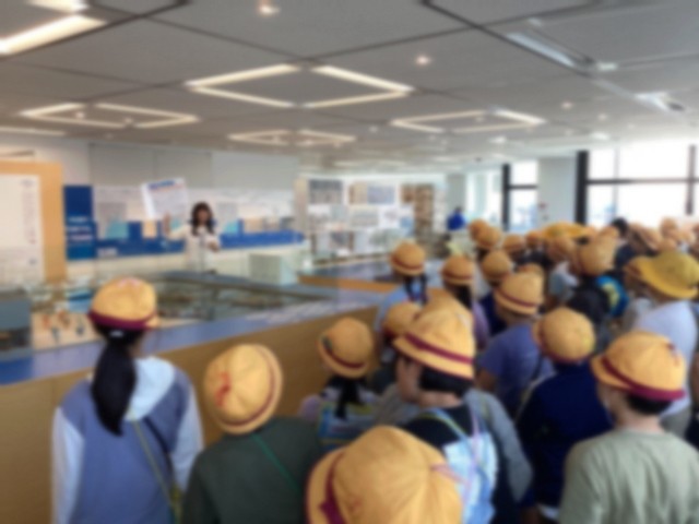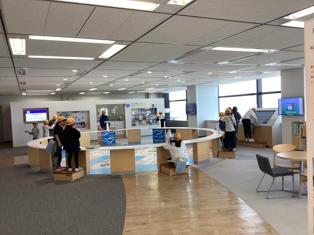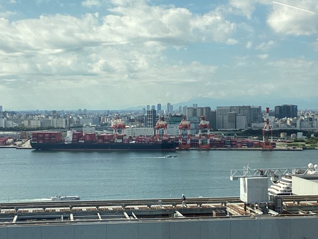 中央防波堤最終処分場を見学した後は、バスで10分ほど移動したお台場地区にある「TOKYTOミナトリエ」を見学しました。東京都港湾局の施設で、東京港や船舶に関する展示のほかに、展望室から東京港やお台場・有明地区を一望できるところです。