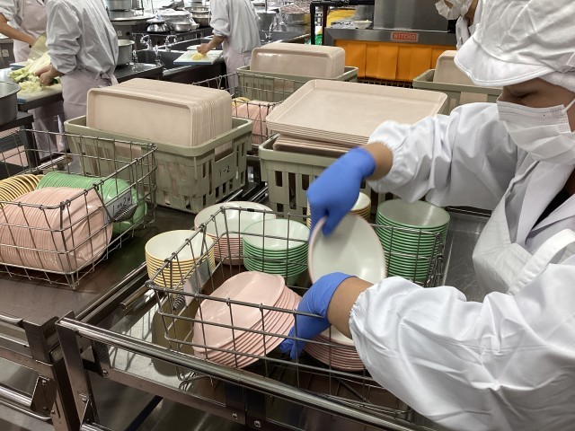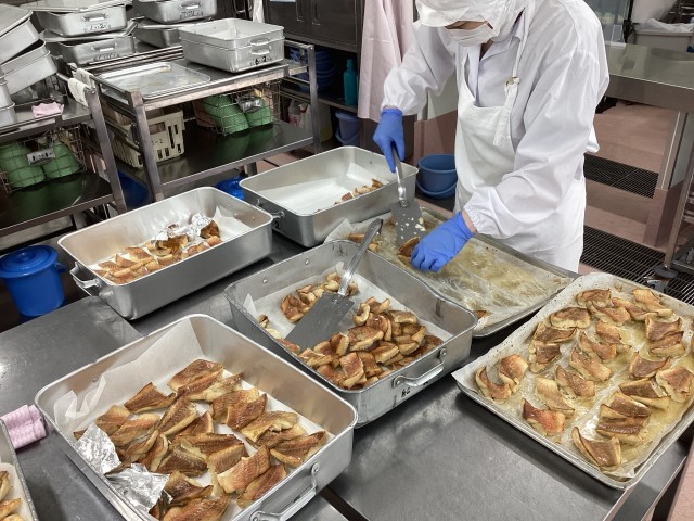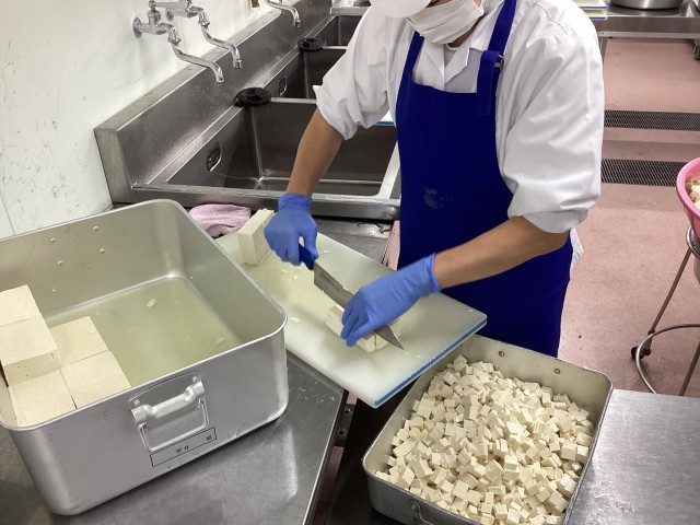 やさいや、とうふをきったり。おさかなをきれいにならべたり。おさらを1まいずつかくにんしたり。きゅうしょくをつくるために、いろいろなさぎょうをしています。