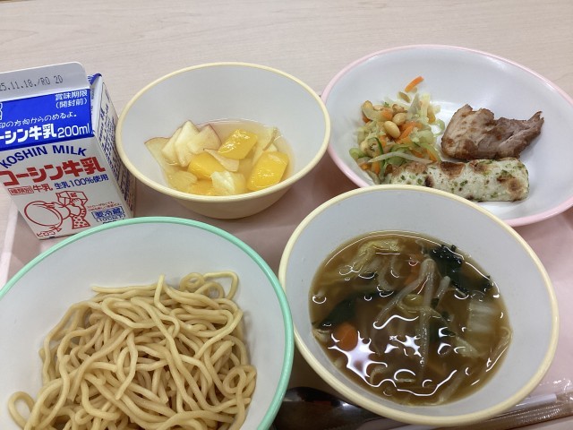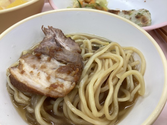 今日のメニューは、カレーライスと並んで人気の「中小岩ラーメン」です。これに、「ちくわの磯マヨ焼き」「中華ごぼうサラダ」「フルーツポンチ」と「牛乳」です。ラーメンのスープは、鶏ガラのほかに、昆布や鰹節、野菜の皮や茎などを一緒に煮込んでとっています。また、焼豚も調理員の皆さんによる手作りです。校内向けの記事に、今日の調理の様子が掲載されていましたので、特別に公開します。