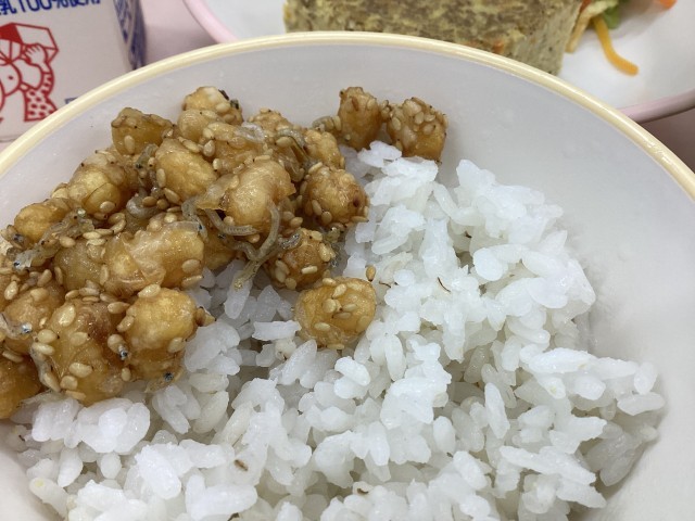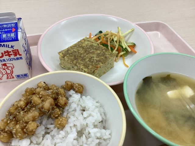 今日のメニューは、「じゃがいものパリパリ和え」に「千草焼き」、「大豆とじゃこの胡麻がらめ付き麦ご飯」、「玉ねぎの味噌汁」と「牛乳」です。今日の野菜の和えものには、千切りにしたじゃがいもを油で揚げたものを使いました。口にするとパリパリとした歯応えが、心地よく感じられます。これとは別に、卵液の中に、鶏ひき肉やにんじん、玉ねぎ、しいたけ、竹の子、ごまなどがよく混ぜてから焼き上げた千草焼きは、これも口にすると様々な歯応えが感じられます。料理を美味しくいただく要素の一つに、口の中に入れた時の感覚があります。一口に美味しい食事と言っても、味覚や視覚、聴覚、触覚などの様々な感覚から感じられるようです。今日の給食は、口内に入れた時の触覚、つまり食感が味にアクセントを加え、おいしさをより引き立てています。