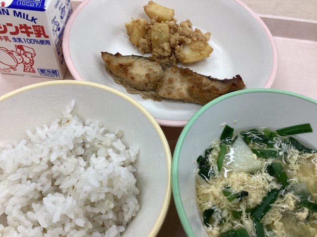 今日のメニューは、「サワラの香味焼き」に「揚げじゃがそぼろ煮」、「麦ご飯」、「にら玉味噌汁」と「牛乳」です。サワラは、ほっそりした体形から、「狭腹」や「小腹」と表記される魚です。また、春になると産卵のため瀬戸内海に集まってくることから、西日本では「鰆」と表記されることが多いです。今日は、産卵前にたっぷりと栄養を蓄えたサワラを使い、ネギとすり胡麻、醤油で作ったタレに漬け、オーブンで焼いて提供しました。