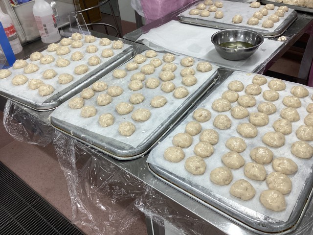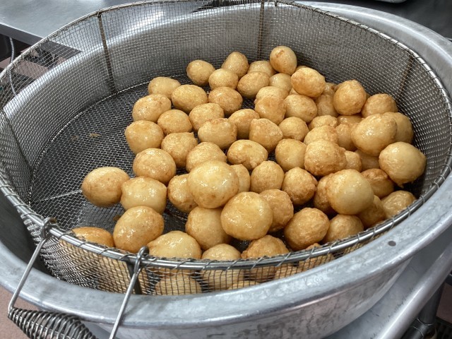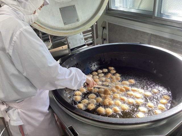 しんじょうあげ。すりみのあげたては、まんまるにふくれています。