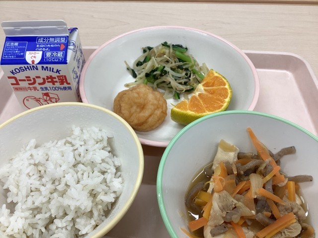 今日のメニューは、「えびしんじょう」に「小松菜のお浸し」、「肉どうふ」、「麦ご飯」、「はやか(早香)」と「牛乳」です。