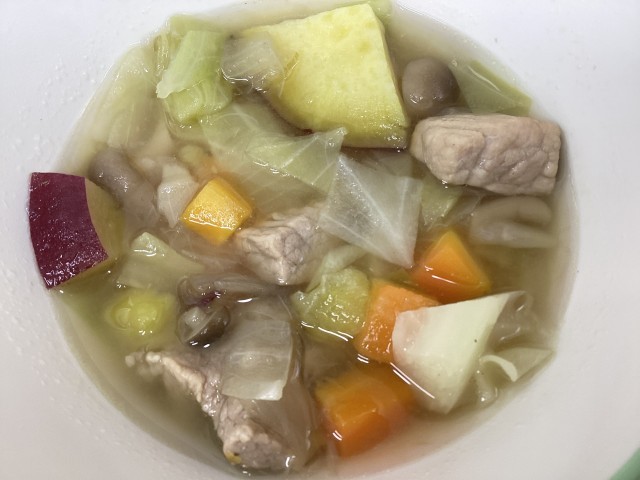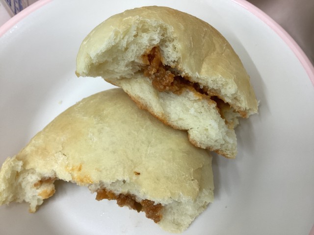 今日のメニューは、「手作りミートパン」に「具だくさんのゴロゴロスープ」、「レモンドレッシングサラダ」、「バナナ」と「牛乳」です。「具だくさんのゴロゴロスープ」には、豚肉やニンジン、カボチャなど8種類の具が入り、肉の旨みや野菜の甘みが感じられる味になるよう調理しました。給食室特製のミートパンの生地を作る際、強力粉やイースト菌、砂糖、塩、油、豆乳を使いました。材料を少しずつ混ぜ合わせ、こねます。そして、出来上がった生地を、暖かい場所に置くと、時間が経つにつれ、イースト菌の働きで記事が膨らんできます。生地が完成したら、一人分ずつにし、別に調理した挽肉や玉ねぎ、トマトなどで調理した具を包み、オーブンで焼きました。