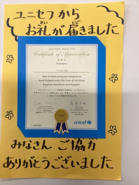 今日(12/8・月曜日)の全校朝会は、校長先生より「学校安全帽の由来」を、生活指導担当からは「朝の登校について」の話がありました。今から58年前に、中小岩小学校に安全に登校できるよう、全校児童に送られたのが、中小岩小学校の学校帽(安全帽)始まりです。黄色をメインにした帽子にしたも、遠くからでも識別できるようにとの願いが込められていたのかも知れません。また、代表委員会より長縄跳びの結果と、ユニセフ募金活動に対してユニセフより感謝状が送られたことについて発表がありました。募金に協力していただきました全て皆様に感謝申し上げます。