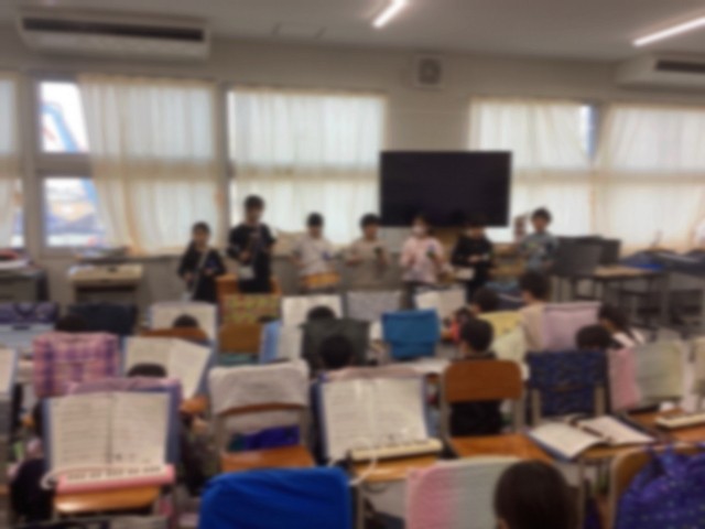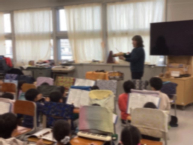 今日(12/9・火曜日)の音楽は、いろいろな打楽器を使って演奏を楽しむ学習です。今日演奏する曲は「メロンの気持ち」で、日本では森山加代子さんがカバーしてヒットした曲として知られています。鍵盤ハーモニカとリコーダー、そしてピアノに合わせ、ギロや小太鼓、木魚、カウベルなどの打楽器を加えて演奏するのが、今日の音楽の学習活動です。弦楽器や金管、木管楽器と違い、打楽器は誰もが簡単に音を出すことができます。それだけに、叩き方を変えたり、リズムや音の大小に変化をつかたりすると、いろいろな表現ができる楽器です。自分の順番が回ってくると、思い思いに打楽器を手にし、メロディーとリズムを感じながら演奏を通して音楽に親しんでいました。