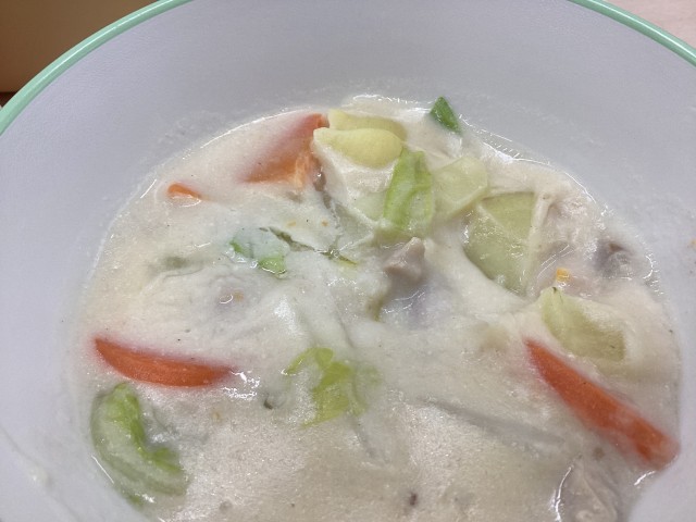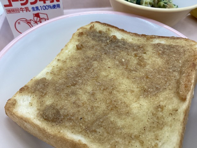 今日のメニューは、「セサミハニートースト」に「冬野菜のクリームシチュー」、「ツナサラダ」、「バナナ」と「牛乳」です。バターとハチミツをぬった食パンに、たっぷりとのゴマをまぶし、オーブンで焼き上げました。ハチミツの甘い香りととともに、ゴマの香ばしさも感じられます。これに、白菜やカブなどの冬野菜たっぷりとを入れたクリームシチューを添えました。