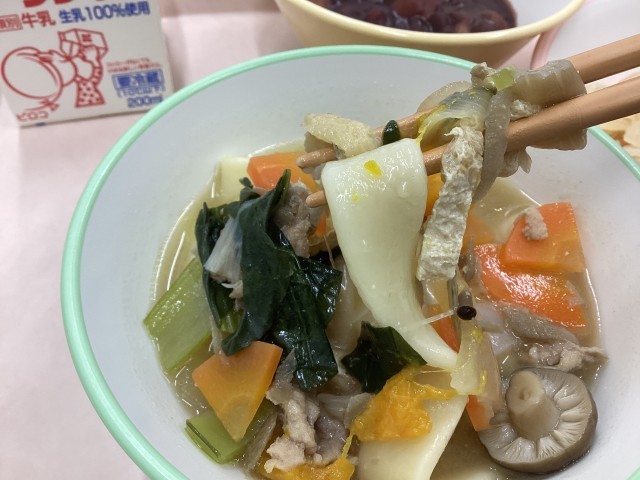 来週22日(月曜日)は、1年のうち最も夜が長く昼短くなる「冬至」です。「冬至」を過ぎると、昼の時間が少しずつ長くなっていきます。今日の給食は、一足早い冬至にちなんだメニューで、「かぼちゃの入ったほうとう」に「ゆずポン酢あえ」、「ししゃもの胡麻焼き」「フルーツ白玉しるこ」と「牛乳」です。ほうとうは山梨を代表する郷土料理の一つで、かぼちゃをはじめ、その地域で収穫できる食材で作られる料理です。ほうとうめんを作る際、塩を入れないで麺うちをするのが特徴で、打ち粉を払わずに他の食材と一緒に鍋で煮込みます。汁にとけた打ち粉が、ちょうどよいとろみとなり、冷めにくくなります。今日のように気温が低い日には、体を温め、美味しくいただける料理です。