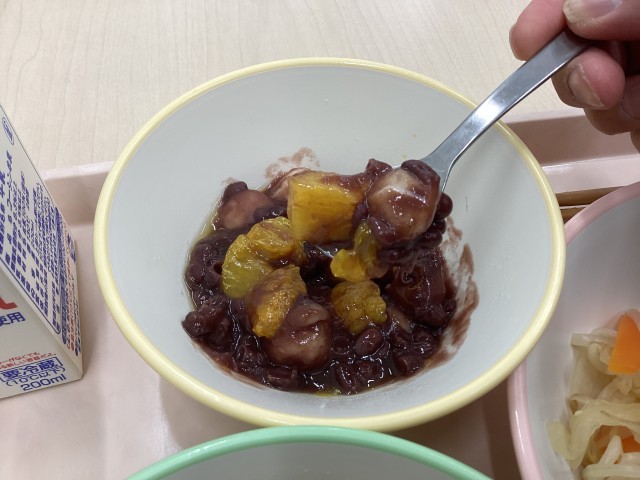 今日の給食は、夏から秋にかけて収穫された栄養価の高いかぼちゃや、昔から赤い色が邪気を払うと信じられ食べられてきた小豆に、「冬至」を「湯治」にかけて「ゆず」を融通を効かせる(体が丈夫になる)にかけて、江戸時代の銭湯から始まったとされる柚子湯にちなんで、ゆずを使った「ゆずポン酢あえ」を組みわせ、冬至メニューとして提供しました。