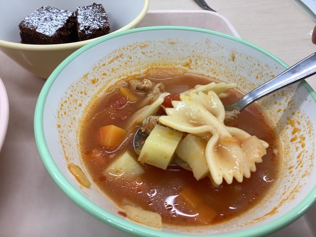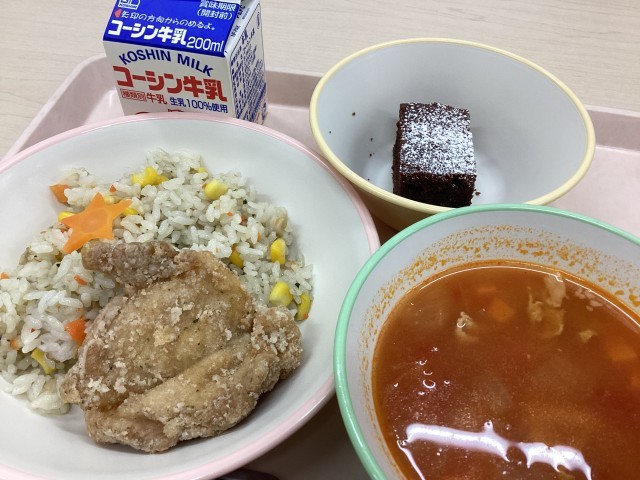 二学期最後の給食は、クリスマスにちなんだメニューです。鶏肉とバターの旨みがしっかりと染み込んだ「クリスマスピラフ」、蝶々のようなリボンの形にしたシュートパスタ(ファルファッレ)が入った「ミネストローネ」、衣がカリッとなるように仕上げた「フライドチキン」、そして、「チョコレートケーキ」は、給食室の皆さんが手作りで、中小岩小学校の皆さんへのクリスマスプレゼントです。これに、「牛乳」を添えてあります。