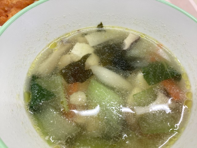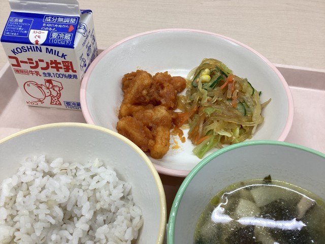 今日のメニューは、人気メニューの一つ「イカのチリソース」を中心に、「春雨サラダ」「豆腐スープ」「麦ご飯」と「牛乳」です。チリソースには、にんにくやしょうが、玉ねぎ、ネギがたっぷりと使われています。片栗粉をまぶして油で揚げたイカとともによく炒め、しょう油とケチャップ、砂糖、豆板醤で味付けてあります。