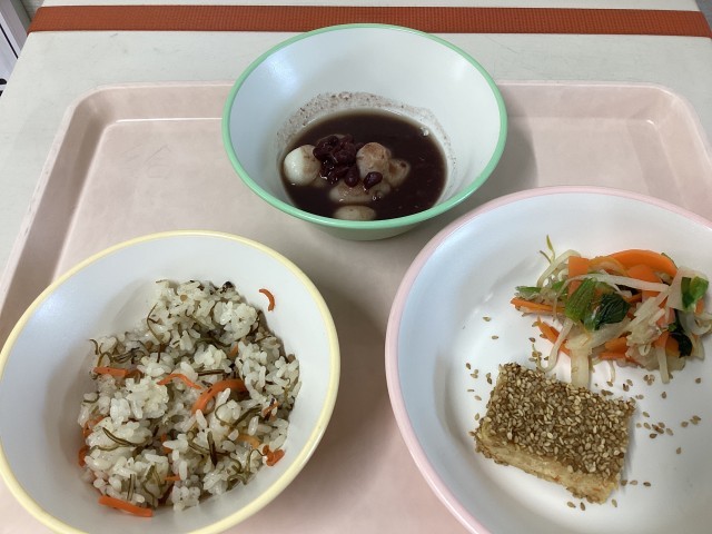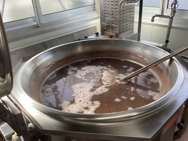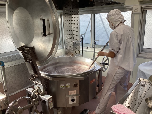 給食室のたきこみごはんは、具材をにた煮汁でごはんをたき、具はあとからまぜています。