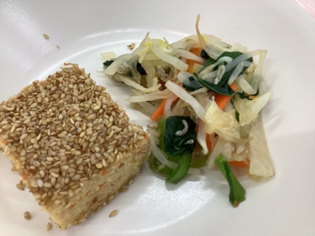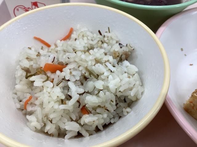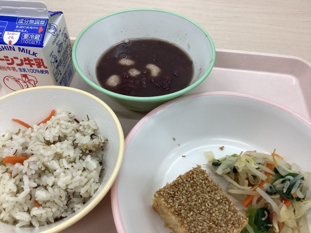 今日の給食は、小豆を使った「お汁粉」や「松風焼き」「こんぶごはん」のほかに、「もやしとじゃこのさっぱり和え」と「牛乳」を組み合わせ、小正月にちなんだ日本の行事食としてメニュをつくりました。