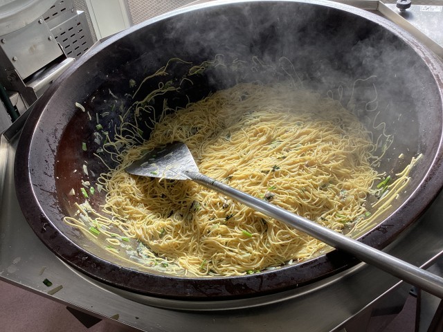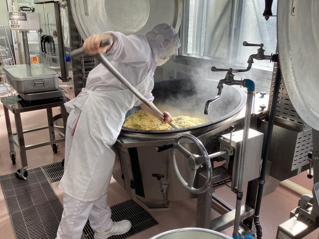 大きなかまで、パスタをまぜます。きゅうしょくさんのお仕事は、力仕事なのです。