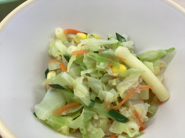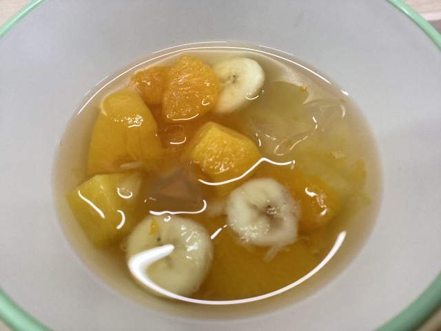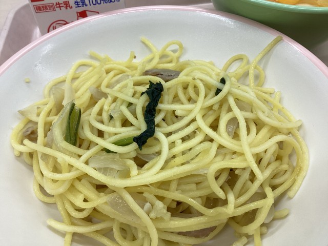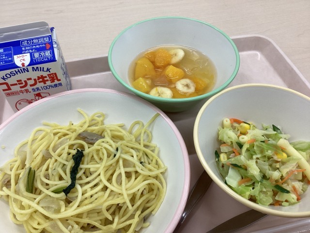 今日のメニューは、小松菜を使った「ペペロンチーノ」に「マカロニサラダ」、「フルーツ寒天ポンチ」と「牛乳」です。今日も、給食室では調理員の皆さんが、給食開始時刻までに提供できるよう、朝から準備・調理しています。