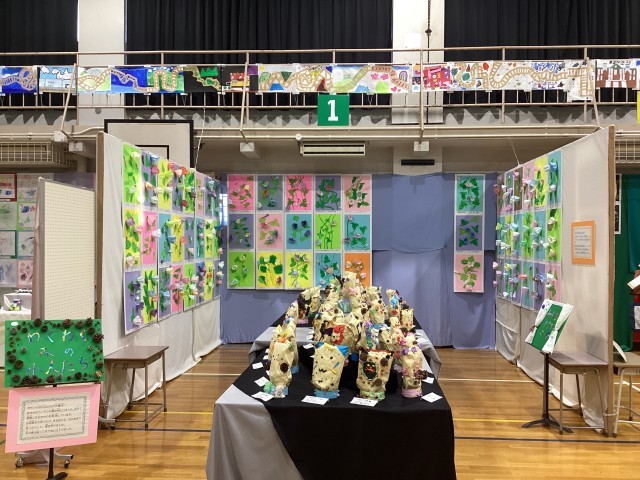 この写真は、「アートハッピーフェスタ」において、1年生の作品を展示したブースです。