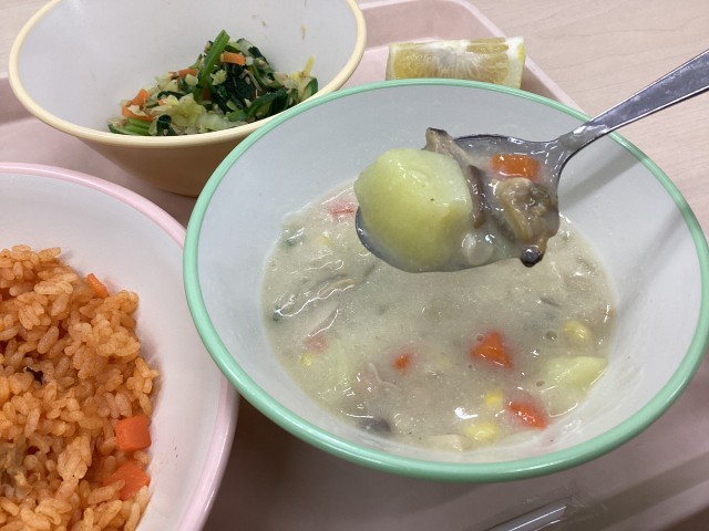 今日の給食は、鮮やかな赤が印象的な「チキンライス」に、それとは対照的なホワイトの「クラムチャウダー」、「ツナと小松菜のサラダ」「はるか」と「牛乳」でメニュー組みました。メニューを考えるとき、食の彩りを上手に整えると、食欲が増すとも言われています。日本料理では、「白」「黒」「赤」「黄」「緑」の五色を基本としているようです。