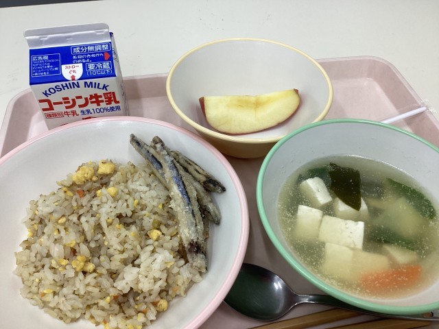 今日のメニューは、「焼き豚チャーハン」に「キビナゴの唐揚げ」、「豆腐とわかめのスープ」「りんご」と「牛乳」です。今朝は、一段と寒さが増し、江戸川区の正午現在の気温は5℃とのことでした。昨日来、寒い日が続いてますが、あたたかな食事をとり、風邪などひかぬよう気をつけてましょう。本日は江戸川区立小学校で教員の研究活動のため、中小岩小学校の児童は給食後に下校します。なお、きこえとことばの教室は、午後も通常通り通級指導を行います。
