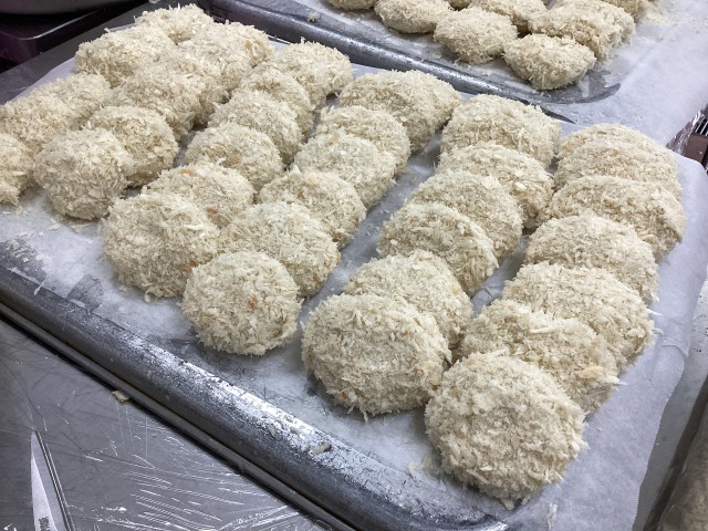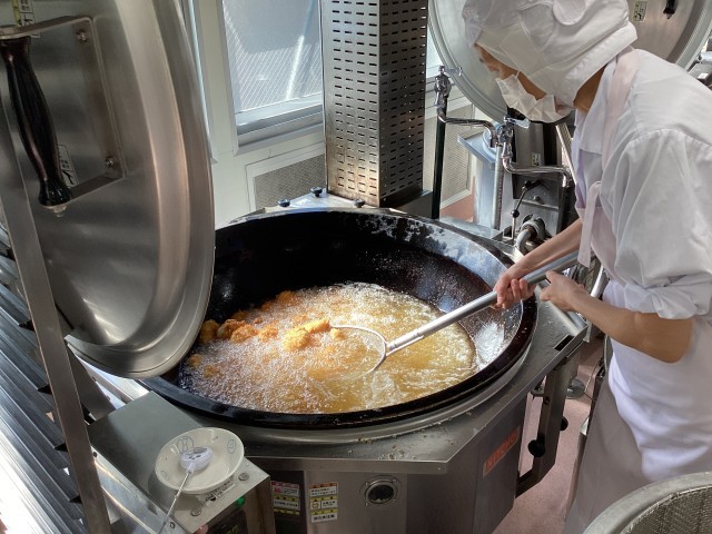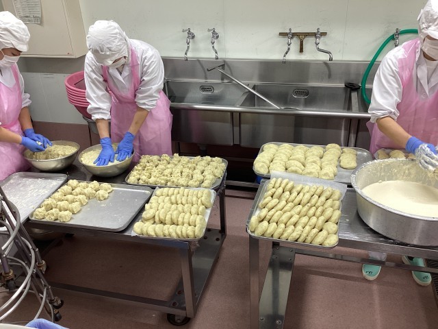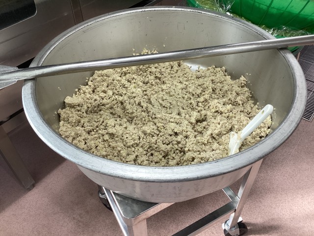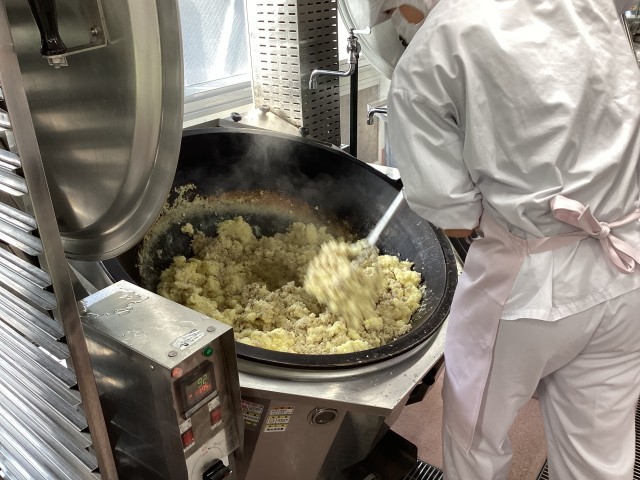 大量のふかした じゃがいもをつぶすのは、大変な力仕事です。