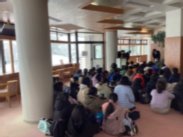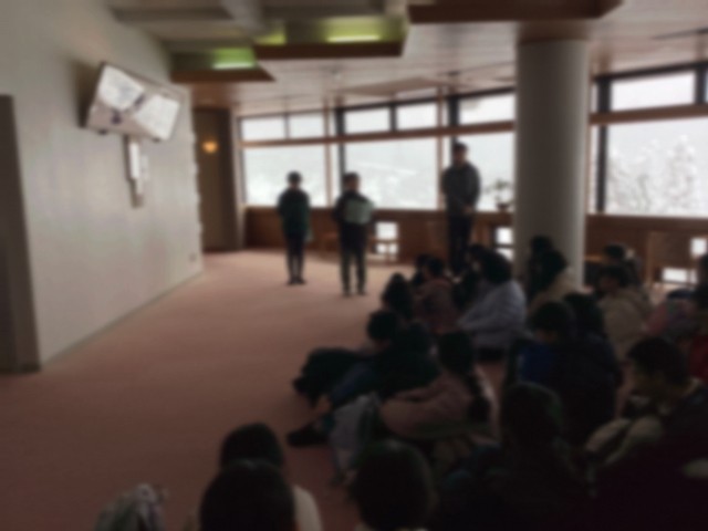 12:30、約5時間をかけて、宿泊先のまつしろ芝峠温泉「ホテル雲海」に到着しました。バスから荷物を降ろした後、ホテル内で開校式を行いました。
