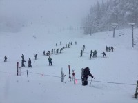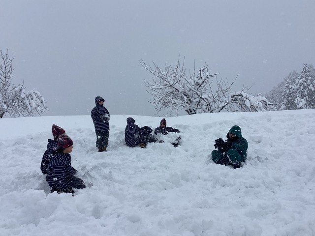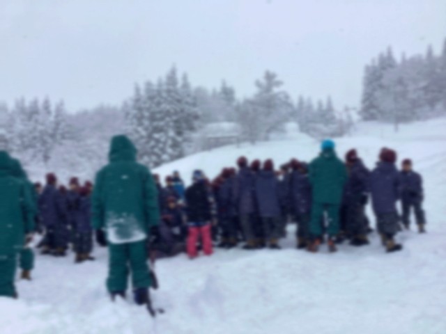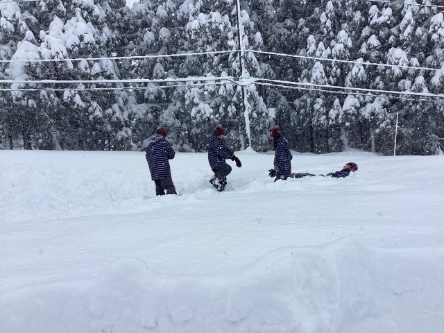 1日目のアクティビティは、ホテル近くでの雪遊びです。昼食を終え、スキーウエアに着替え、いざ広場へ。明日のスキーに向け、小1時間ばかり楽しく雪と戯れました。