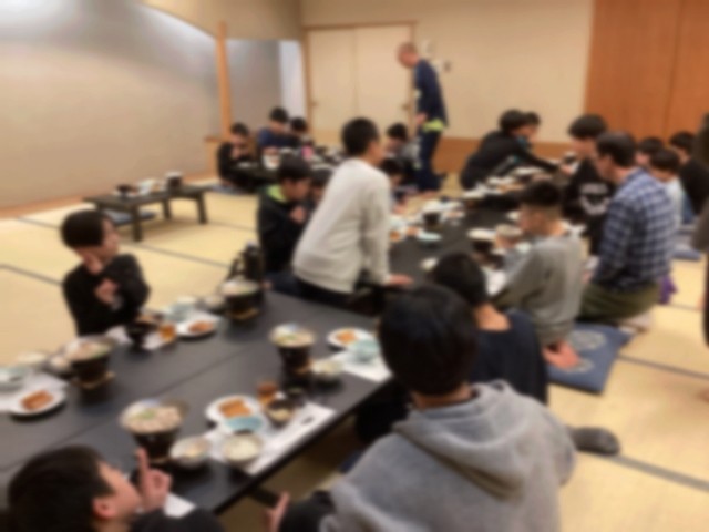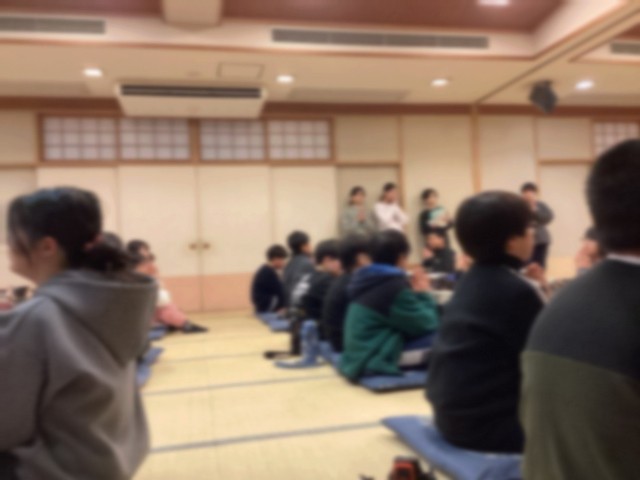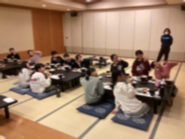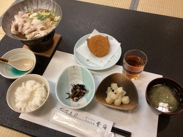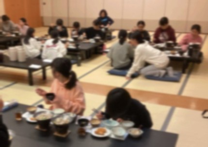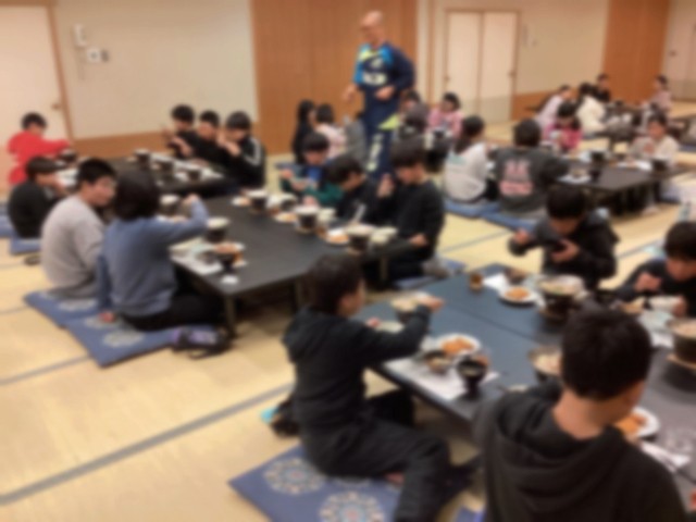 2日目の夕食のメニューは、「豚あんぽ鍋」に「えびかつ」、「ひじき煮」「春巻き」「ジャーマンポテト」「味噌汁」と「ごはん」です。思いっきりスキーを体験した後の、待望の夕飯です。夕飯の後は、楽しいレクレーションが待っています。