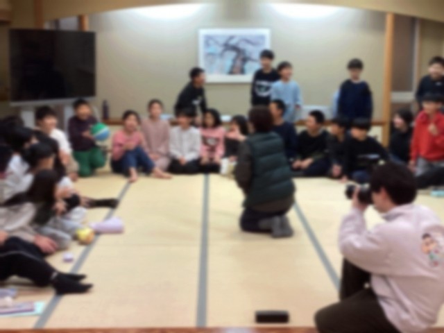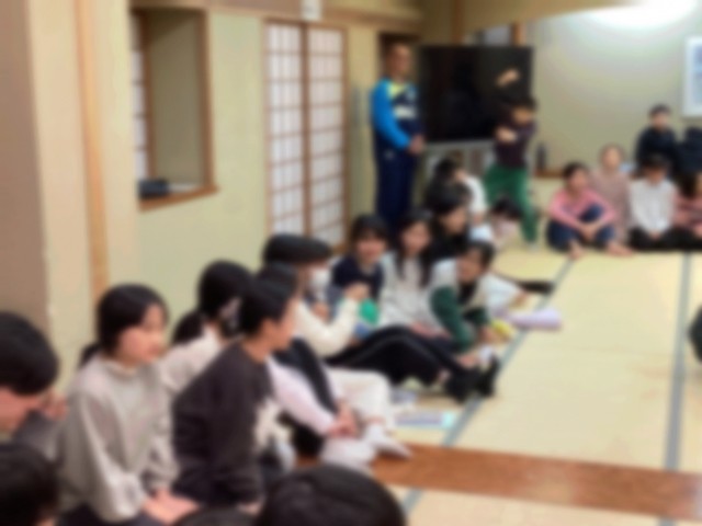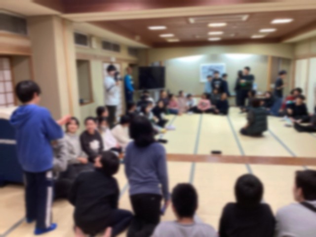 続いて、「爆弾ゲーム」です。ボールを音楽に合わせ隣の人に回し、音が止まった時にボールを持っていた人がまけとなるゲームです。今日のお題は、「今まで食べた中で美味しかったもの」、「ウインタースクールで楽しかったこと」。ハラハラドキドキしながら、負けても楽しく参加できるゲームです。ちなみに、一番楽しかったことで1位は「スキーができたこと」でした。