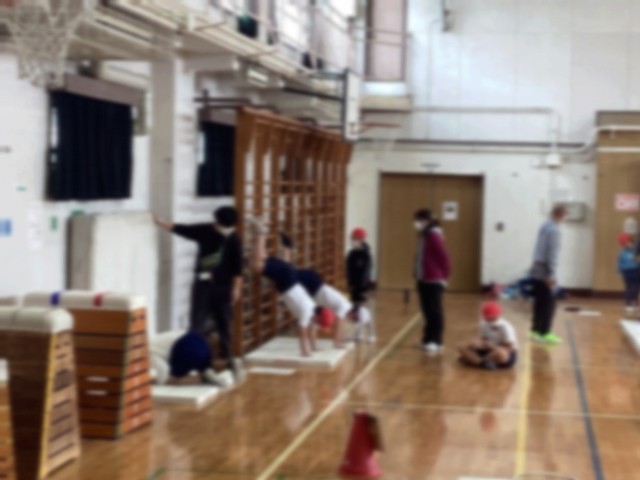 今日(2/18・水曜日)のみどり学級の体育の学習は、中小岩スポーツ館のフロアを使った運動です。みどり学級の体育は、1〜6年全体で行なっています。今日の学習は、マットや跳び箱、壁面をを使い、体つくりの運動やマット運動に取り組みました。