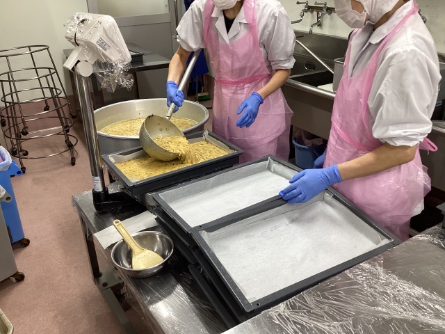 給食のたまごやきは、大きな鉄板に流しこんで焼きます。