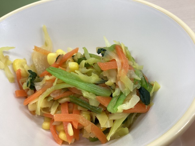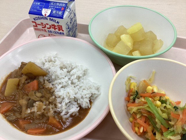 今日のメニューは、「チキンカレーライス」に「コーンサラダ」、「パイナップルかんてん」と「牛乳」です。「コーンサラダ」には、コーンのほかに、にんじんやキャベツ、小松菜が入り、特製のドレッシングで和えてあります。