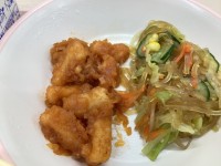 今日のメニューは、「タンドリーチキン」と「コーンピラフ」、「キャベツのスープ」に「彩りサラダ」と「牛乳」です。「タンドリーチキン」とは、タンドゥールという壺型のオーブンで焼いたインドの料理の一つです。「タンドリーチキン」は香辛料を加えたマリネ液に漬け込んで調理する料理です。そのマリネ液を無糖のヨーグルトに変えて漬け込むと、鶏肉が一層柔らかくなり味も美味しくなりようです。給食では、カレー粉と隠し味ていどケチャップを加えたヨーグルトに鶏肉を漬け込み、給食室にあるオーブンで焼きました。