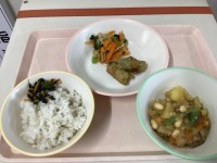 おわんをてにもって、いただきましょう。きゅうしょくしつには、いろいろなちょうみり...