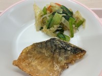 今日のメニューは、「サバの竜田揚げ」に「キャベツのおかか和え」、「ゆかりご飯」「...