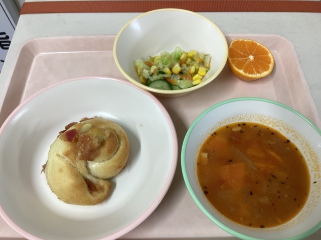 今日のメニューは、給食室特製の手作り「アップルロールパン」に、「ブイヤベース」「...