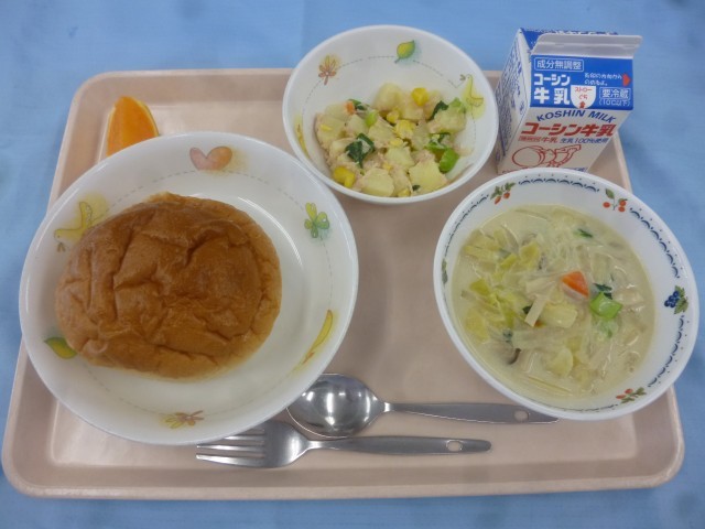ハムチーズトースト、牛乳、コロコロサラダ、春キャベツのクリームスープ、清見オレンジ