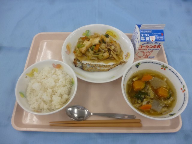 ごはん、厚揚げと豚肉のみそ炒め、ししゃもの香味焼き、いろどり汁、牛乳