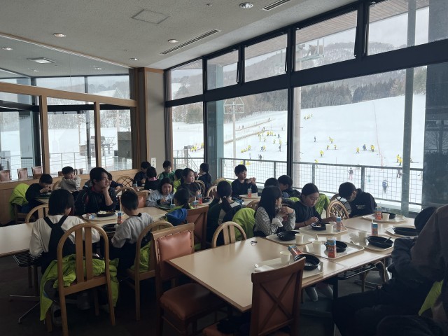 午前中のスキー学習を終えて、昼食の時間になりました。温かいカレーライスを食べて、...