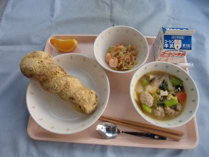 ・きなこ揚げパン・牛乳・肉団子スープ・えびと春雨のサラダ・ネーブルオレンジ(右)でした。