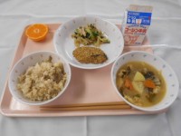 ・秋の香りごはん・さごしのホイル焼き・キャベツと大豆のカミカミあえ・かまぼこと小...