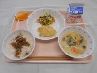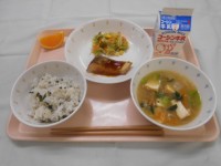 ・ごはん・おかかふりかけ・鶏肉のさざれ焼き・小松菜とちくわのおひたし・豆乳入りみ...