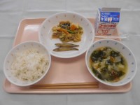 ・ごはん・ごまと小松菜のふりかけ・鶏肉と豆腐のつくね揚げ・茎わかめと切干大根のあ...