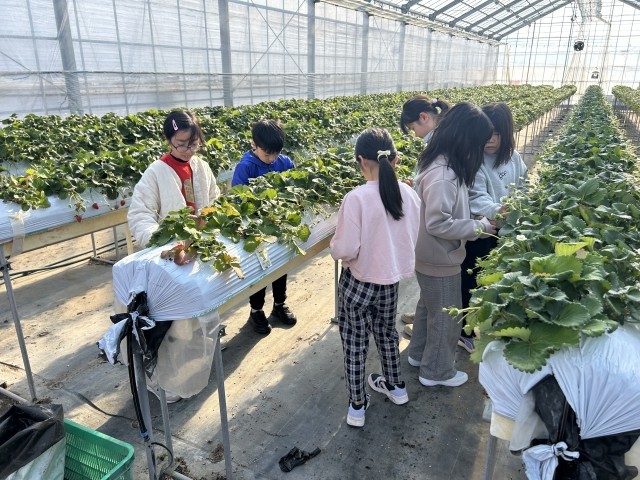 宿舎を出て約1時間。原田農園に着きました。 今日は、「かおり野」と「やよい姫」の2種類を食べ比べました。 朝食のバイキングから3時間。いちごは別腹です。