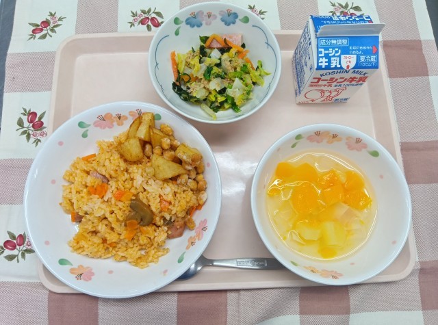 献立:チキンライス・ポリポリ大豆ポテト・ごまドレサラダ・フルーツポンチ・牛乳 4...