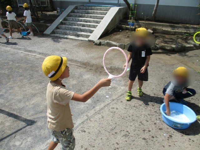 高い空までシャボン玉が飛んだり、手のひらにシャボン玉をのせて楽しんでいました。みんな楽しく活動をすることができました。