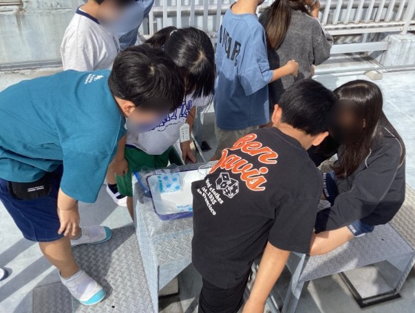 4年生の理科では、空気中の水蒸気について調べました。屋上や教室、校庭、体育館などいろいろな場所に氷や保冷剤を仕掛けて、水蒸気が冷やされて水滴になるようすを調べました!