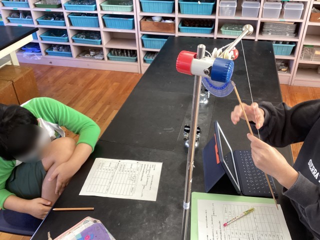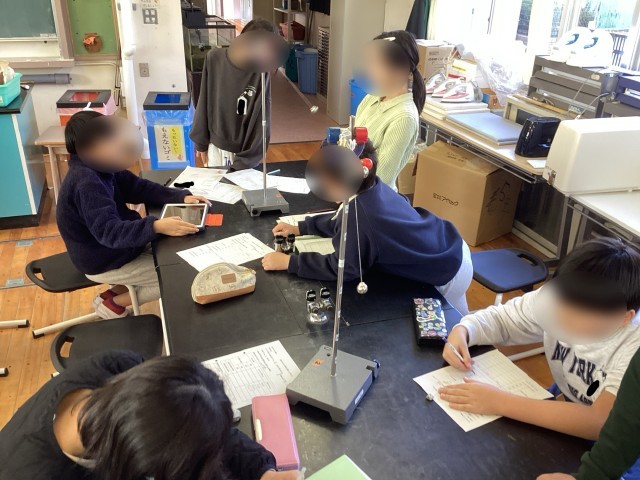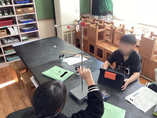 5学年の理科では、ふりこについて学習しています。ふりこの長さ、ふれ幅、おもりの重さのどれが1往復する時間に関わるのかを調べました。物理の世界への第一歩です!