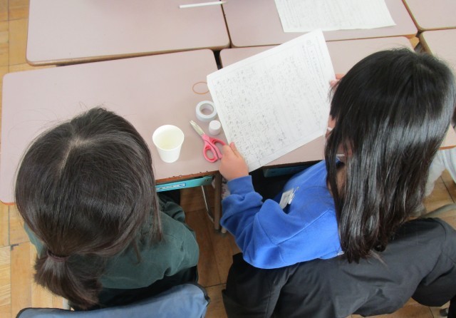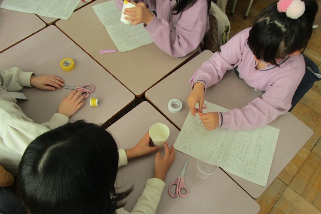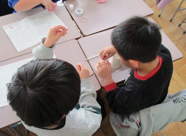 2年生は国語「おもちゃの作り方をせつめいしよう」の学習で学んだことをいかして、1年生に色々なおもちゃの作り方を説明しました。一緒に作る中で、思い通りに伝わらなくて苦戦する場面もありましたが、みんなで楽しく活動することができました。